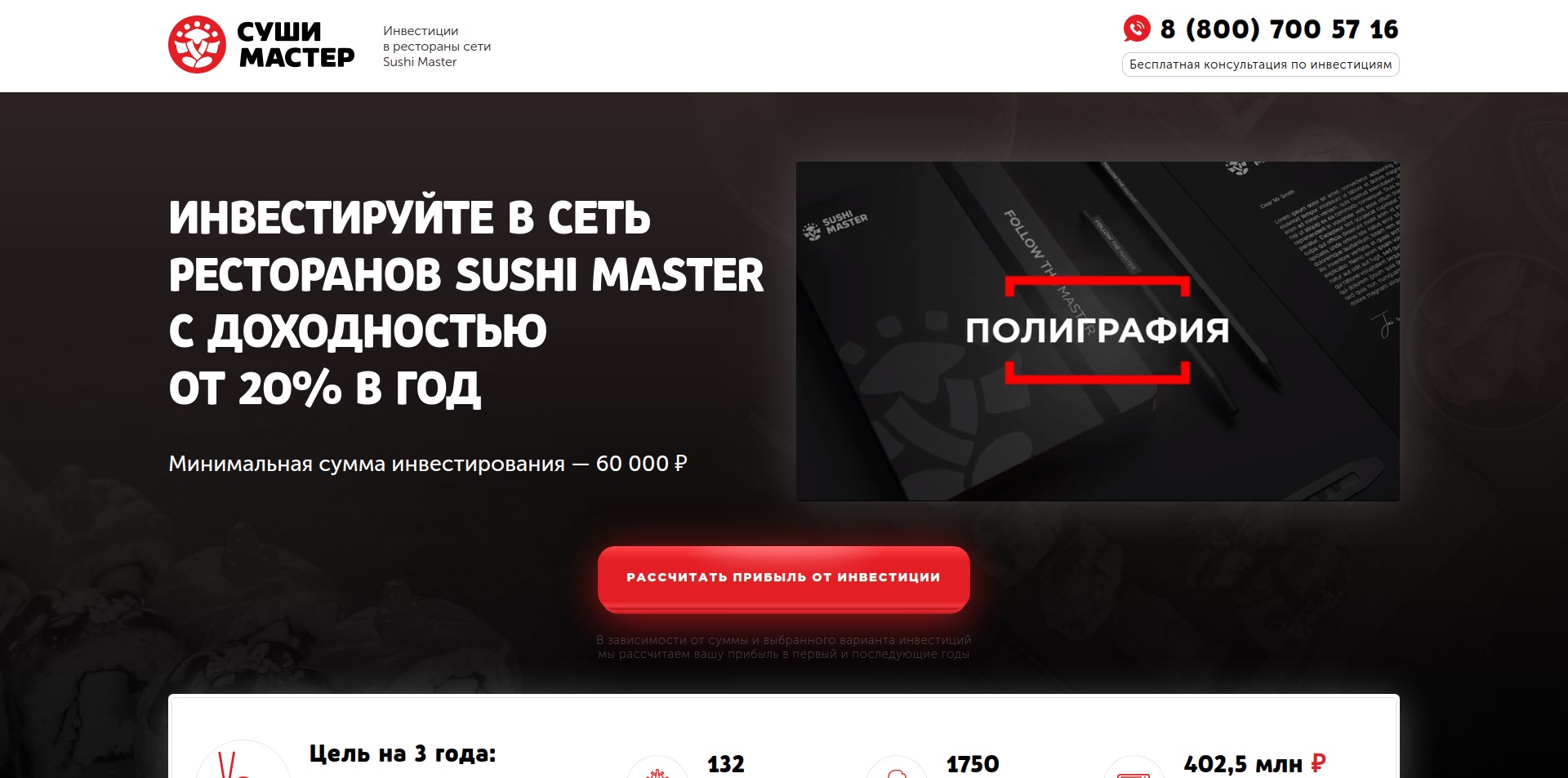 Лэндинг про инвестиционную программу в «SushiMaster»