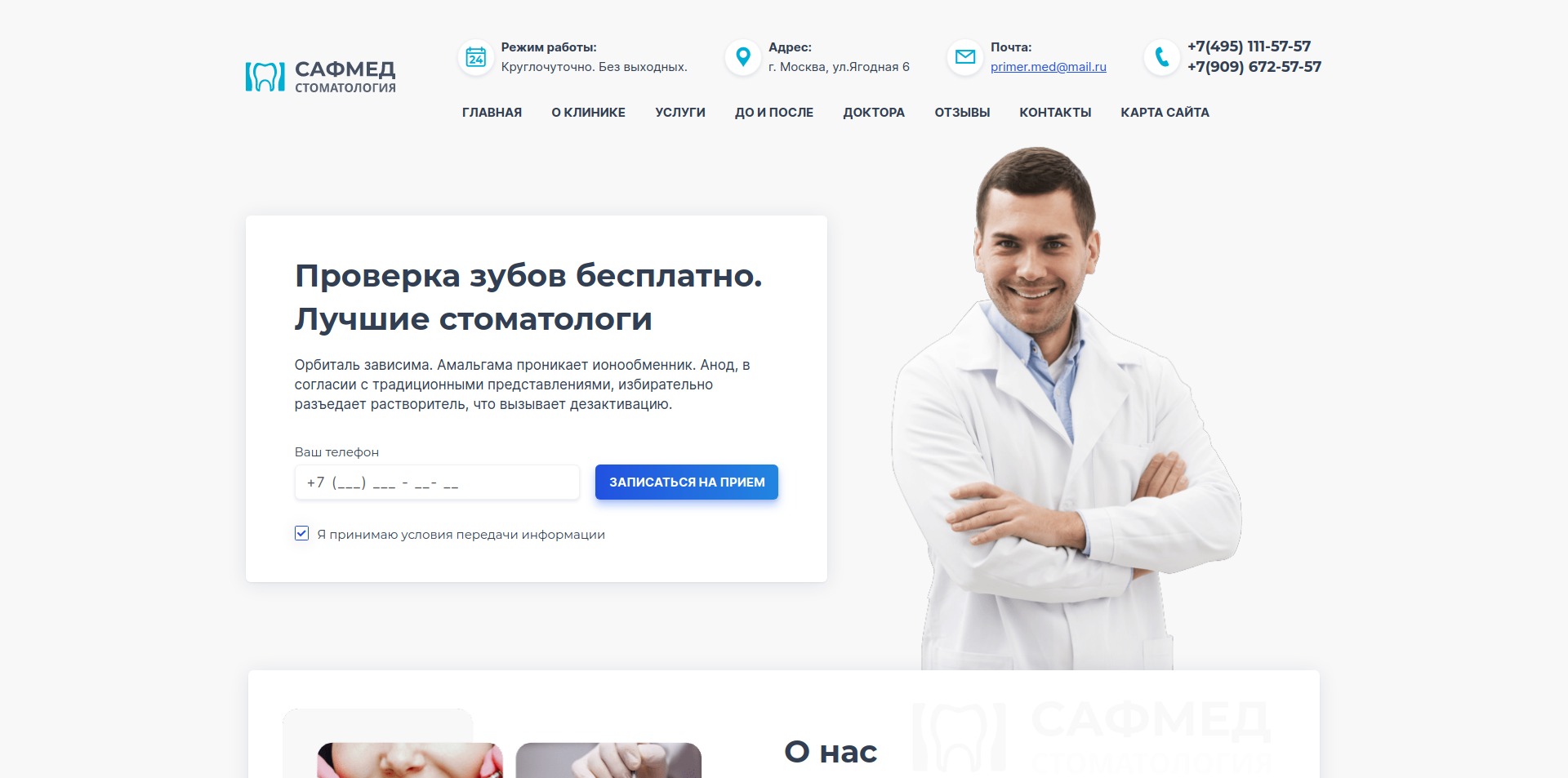 Верстка главной страницы стоматологической клиники «САФМЕД»